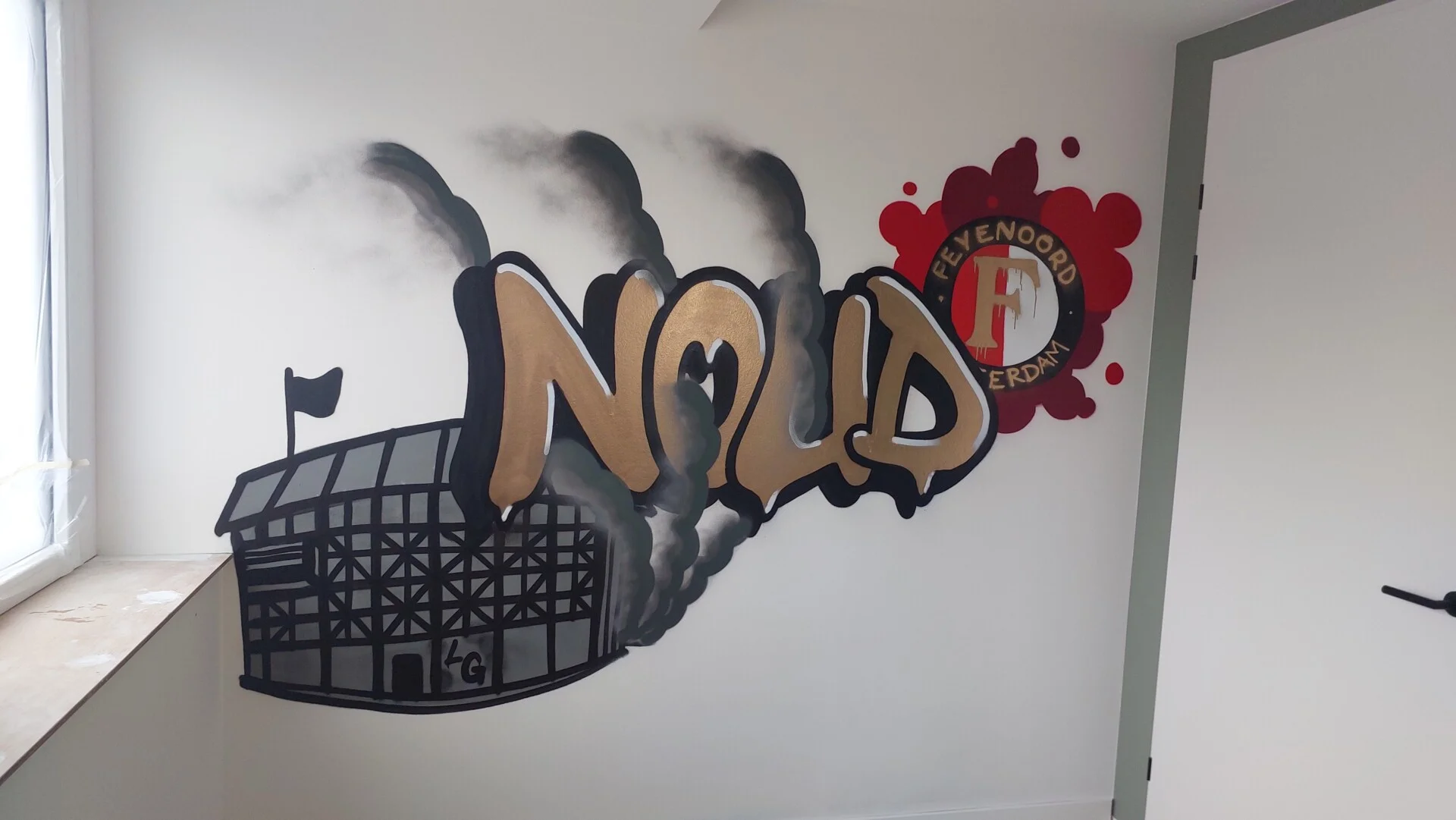 Een stoere graffiti decoratie in de slaapkamer van Noud, met zijn naam groot en speels verwerkt in gouden letters. Het iconische Feyenoord-logo en een herkenbare versie van De Kuip maken het geheel compleet. De street-art stijl en krachtige rood-witte accenten geven de kamer een energieke, persoonlijke sfeer voor een echte Feyenoord-fan.